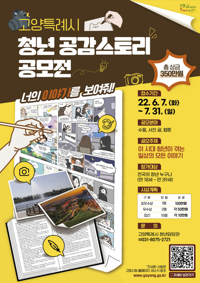 [부자동네타임즈 김인수기자] 고양시가 청년의 다양한 이야기를 찾기 위해 ‘청년 공감스토리’ 공모전을 실시한다. 청년이라면 지역 상관없이 누구나 참가할 수 있으며 7월 31일까지 참가 신청‧접수받는다.