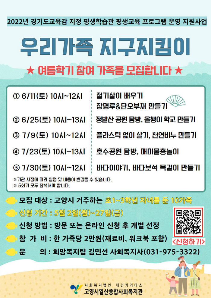 [부자동네타임즈 김인수기자] 고양시일산종합사회복지관(관장 최찬영)에서 가족여가 지원사업 ‘우리가족 지구지킴이’ 여름학기 참여 가족을 5월 2일부터 27일까지 모집한다.