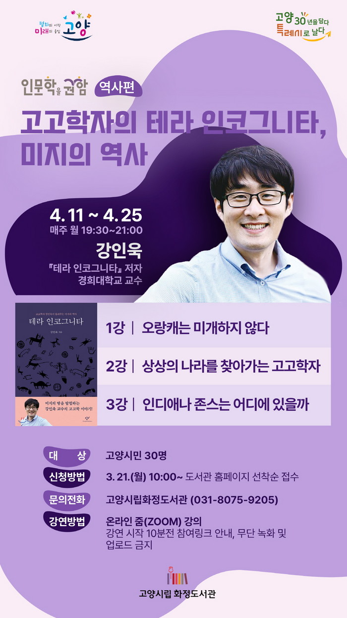 [부자동네타임즈 김인수기자] 고양시 화정도서관이 연중 테마강좌인 ‘인문학을 권함: 역사편’을 4~5월 진행한다. 테라 인코그니타의 저자 강인욱 교수, 식탁 위의 한국사의 저자 주영하 교수가 흥미로운 역사 강연을 펼칠 예정이다.