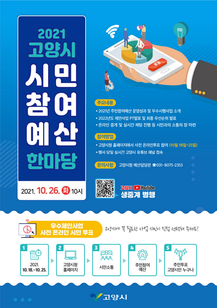 [부자동네타임즈 김인수기자] 고양시가 오는 26일(화) 오전 10시부터‘고양시 시민참여예산 한마당’을 고양시 행주동 고양인재교육원에서 생중계한다.