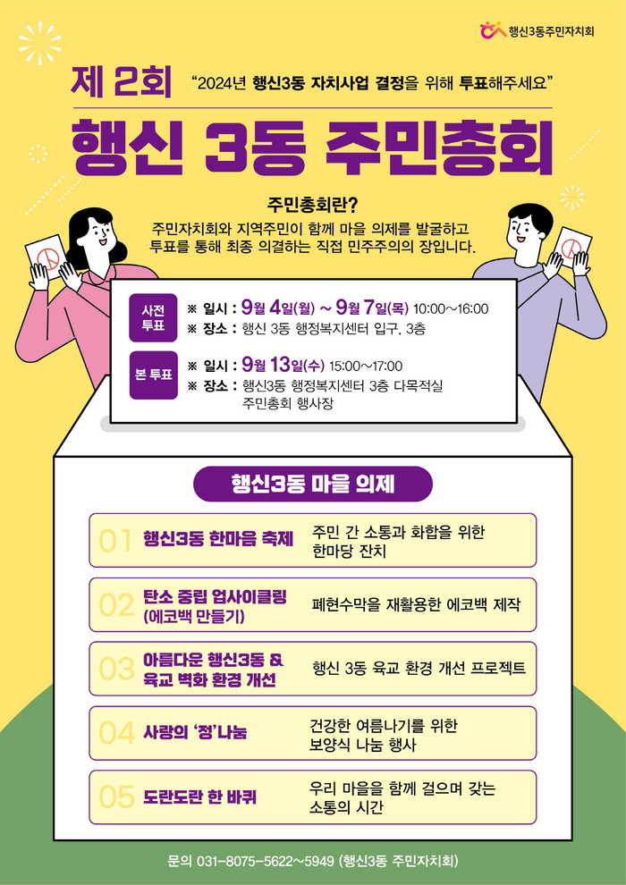 주민총회는 주민자치회를 중심으로 주민이 직접 발굴한 마을 제안사업의 우선순위를 투표로 결정하는 행사로서, 주민 누구나 참여할 수 있다. 올해 두 번째를 맞는 행신3동 주민총회는 주민의 참여도 제고를 위해 주민총회에 앞서 사전투표를 시행한다.
