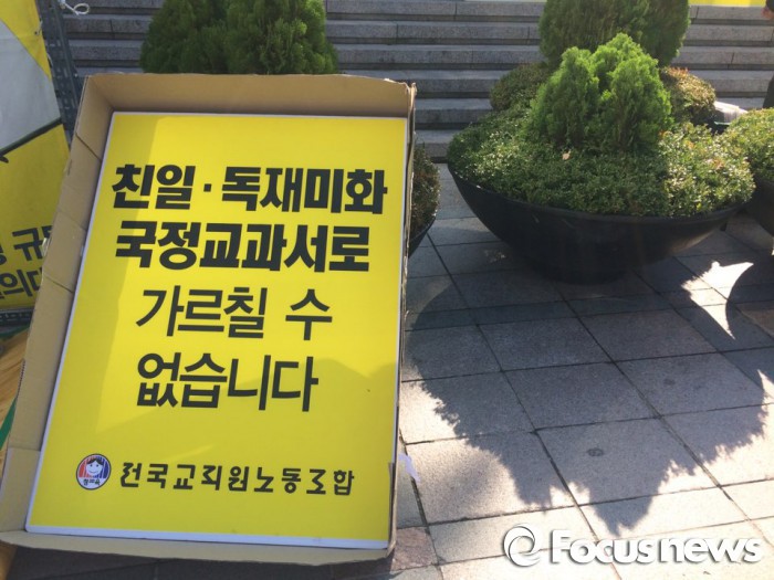 (서울=포커스뉴스) 전국교직원노동조합(전교조)은 29일 오전 11시쯤 서울 중구 파이낸스센터 앞에서 '한국사교과서 국정화 반대 교사 시국선언' 기자회견을 열었다.