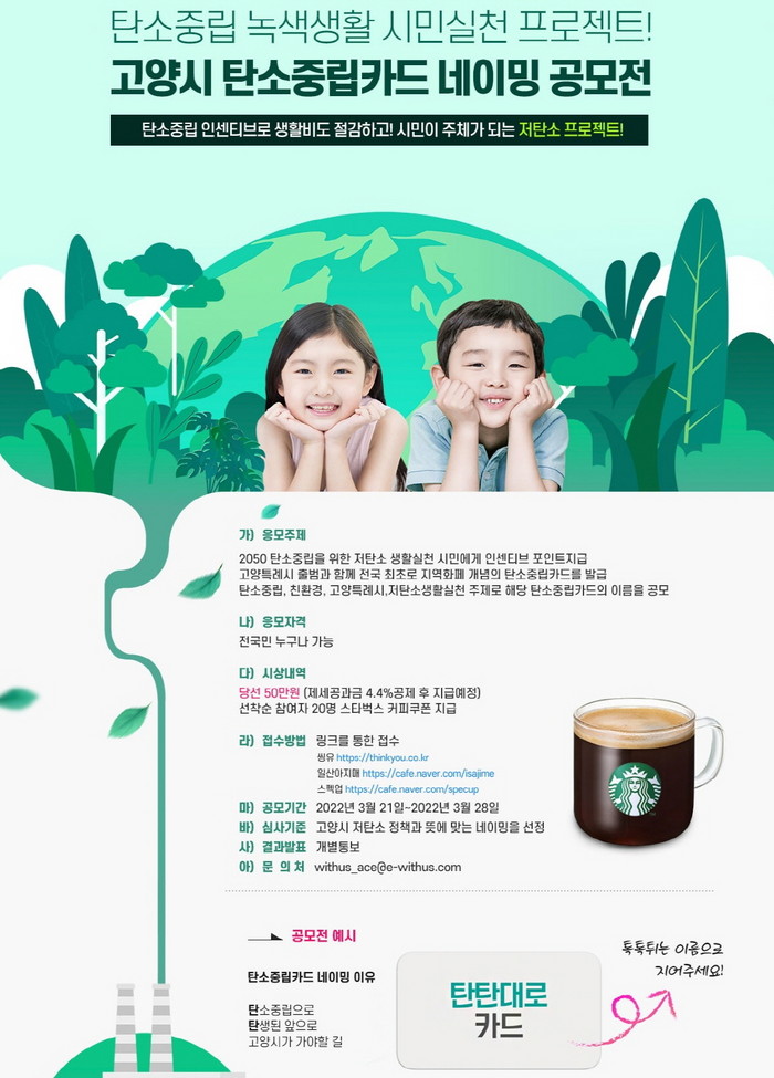 시는 탄소중립 사회 조성을 위하여 녹색생활 실천 시민에게 인센티브를 주는 지역화폐 개념의 탄소중립 카드를 발급할 계획이다. 카드 발급에 앞서 시민이 그 취지를 쉽게 이해하고 사용할 수 있도록 카드 명칭을 공모해 카드에 대한 시민 의견을 듣고자 한다.