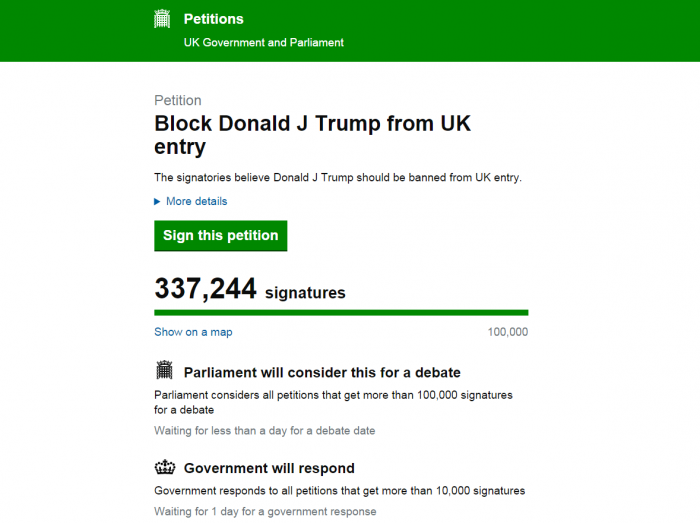 | △ 트럼프의 입국을 금지하는 온라인 청원에 9일(현지시간) 33만여 명이 서명했다. 10만명이 넘으면 의회에서 논의돼야 한다. <사진출처=UK parliament> |