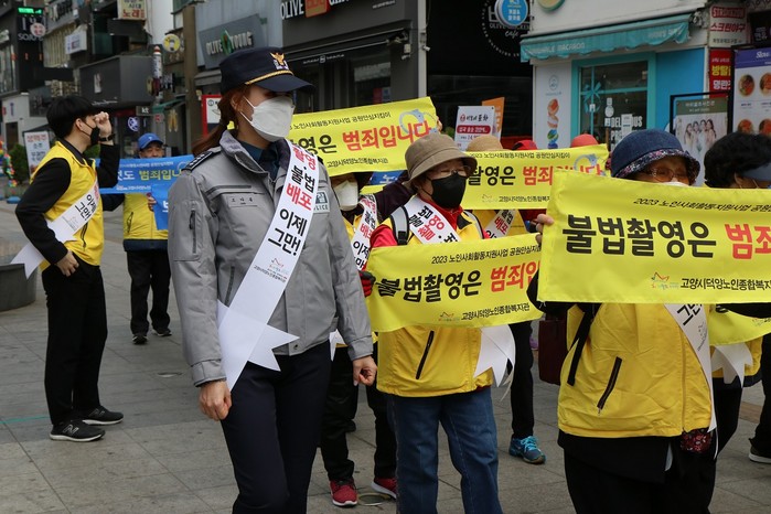 이날 고양시덕양노인종합복지관의 노인일자리 공익활동 사업단인 ‘공원안심지킴이’ 참여자들은 시민들의 불법촬영 근절 동참을 유도하며 화정역 광장에서 화정 중앙공원까지 행진했다. 또한 캠페인 이동경로에 홍보부스를 설치하고 불법촬영 근절 안내문을 배부했다.
