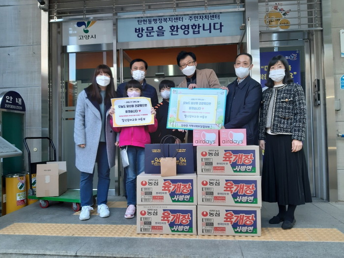 [부자동네타임즈 김인수기자] 고양시 일산서구 탄현동 행정복지센터(동장 박상원)에서는 "지난 21일 탄현동 일산감리교회 아동부(담임목사 배경모)가 라면 5박스, 마스크 300개와 마스크 스트랩 21개를 기부했다."고 밝혔다.