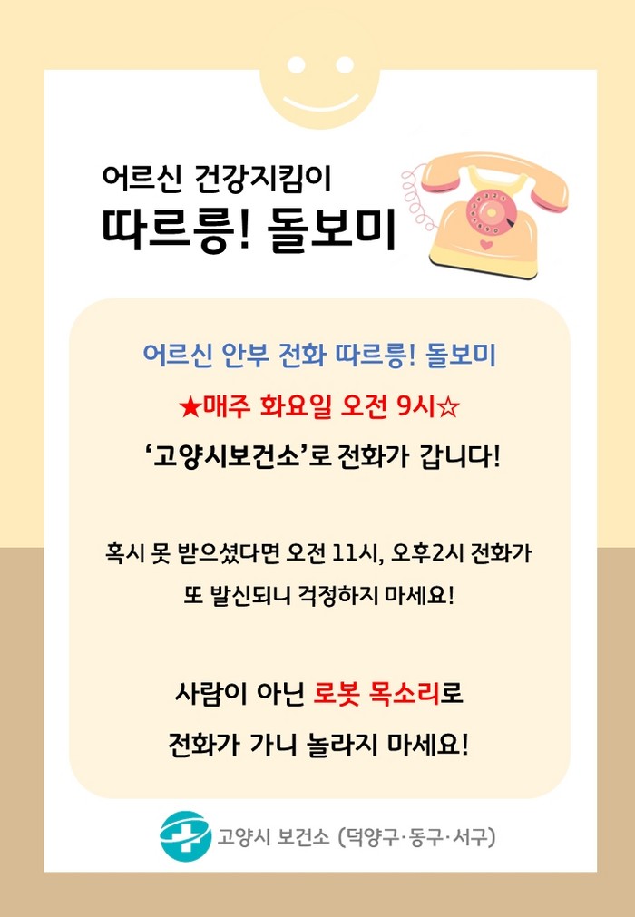 보건소 관계자는 “인공지능 돌봄전화가 독거노인, 75세 이상의 노부부 등 사회적 고립이 우려되는 어르신의 건강관리와 고독사 방지에 큰 도움이 되고 있다”고 전했다.
