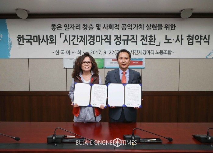 [부자동네타임즈 신동현 기자]한국마사회(회장 이양호)는 9월 22일(금) 좋은 일자리 창출 및 사회적 공익가치 실현을 위한「시간제경마직 정규직 전환 노·사 협약식」을 개최했다.