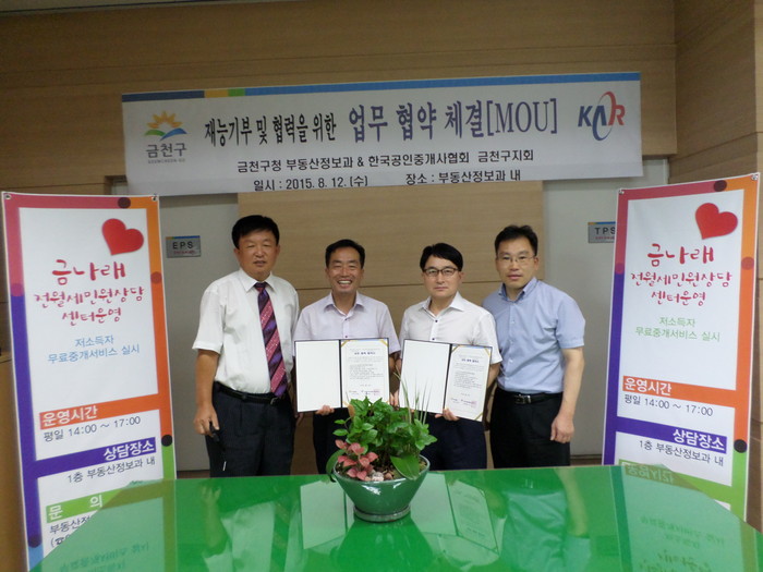 재능기부 중개업소는 부동산중개업소 출입문에 부착된 재능기부 중개업소 지정스티커나 금천구 홈페이지에서 확인 가능하다.