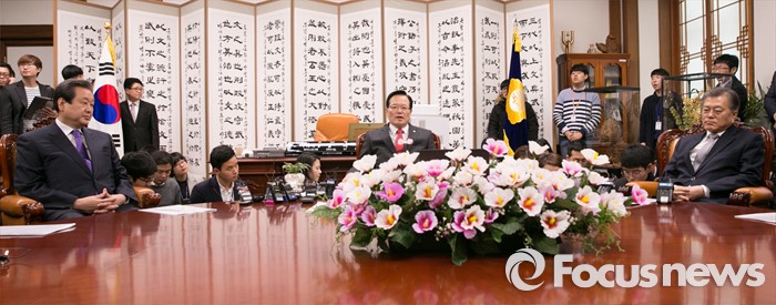 | △ 지난 3일 오전 서울 여의도 국회에서 정의화(가운데) 의장과 김무성(왼쪽) 새누리당 대표, 문재인 새정치민주연합 대표가 선거구 획정 관련 논의를 하고 있다. <사진제공=포커스뉴스> |
