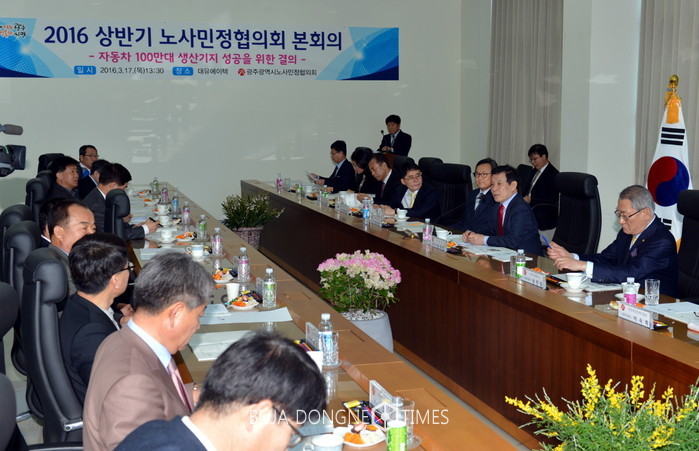 이날 회의에는 윤종해 한국노총광주지역본부의장, 오병교 광주경영자총협회 상임부회장, 김영현 광주시교용노동창장 등 노사민정 대표 20여 명이 참여해 '자동차 100만대 생산기지' 성공을 노사민정협의회 결의문을 채택했다.