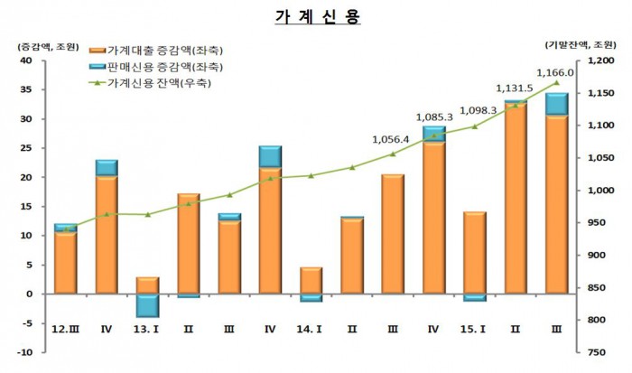 24일 한국은행이 발표한 '2015년 3분기 중 가계신용(잠정)'에 따르면 국민들의 가계 빚을 나타내는 가계신용 잔액은 지난 9월 말 기준 1166조원으로 2002년 4분기 통계 편제 이후 최대치를 기록했다.