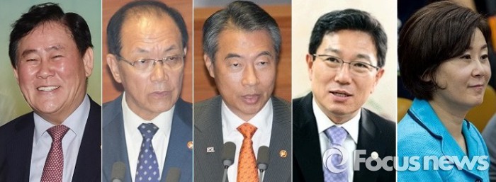 | △ 박근혜 대통령이 프랑스와 체코 순방을 마치고 귀국하는 5일 이후로 총선용 개각이 이뤄질 전망이다. 사진은 왼쪽부터 최경환 경제부총리 겸 기획재정부 장관, 황우여 사회부총리 겸 교육부 장관, 정종섭 행정자치부 장관, 윤상직 산업통상자원부 장관, 김희정 여성가족부 장관. <사진제공=포커스뉴스> |