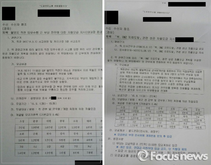 | △ 정의당이 16일 공개한 '불모지 작전 임무수행 간 부상 전우에 대한 자율모금 지시'(왼쪽)와 '북, DMZ 지뢰도발 관련 성금 자율모금 지시' 공문. 2015.11.16 <사진제공=포커스뉴스> |
