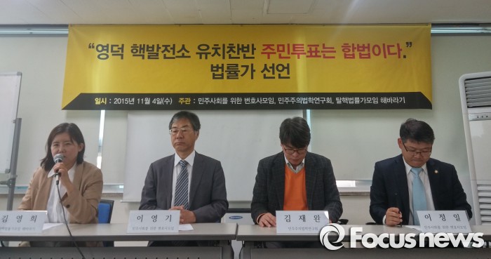 | △ 4일 오전 11시 서울 서초구 서초동 민변 사무실에서 민주사회를 위한 변호사모임(민변)과 민주주의법학연구회, 탈핵법률가모임 해바라기 등 3개 법률가단체가 영덕핵발전소 유치 찬반 주민투표는 합법임을 주장하는 기자회견을 열고 있다. <사진제공=포커스뉴스> |