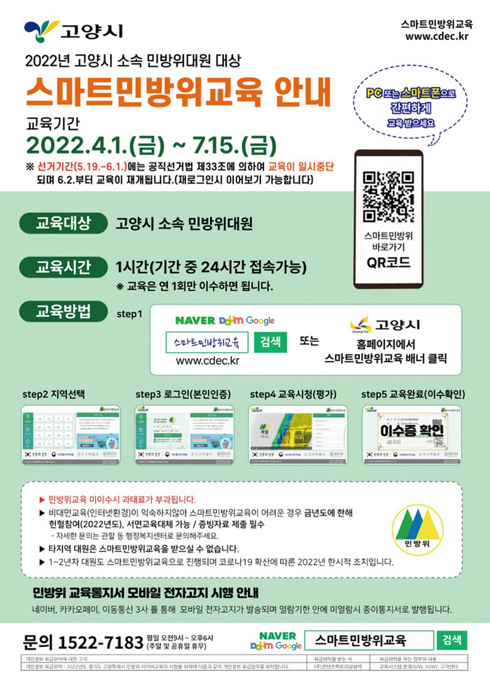 고양시 민방위 대장 및 대원 등 63,000여 명을 대상으로 실시되는 사이버교육은 연차에 상관없이 1시간 이수하면 교육 이수로 인정된다.