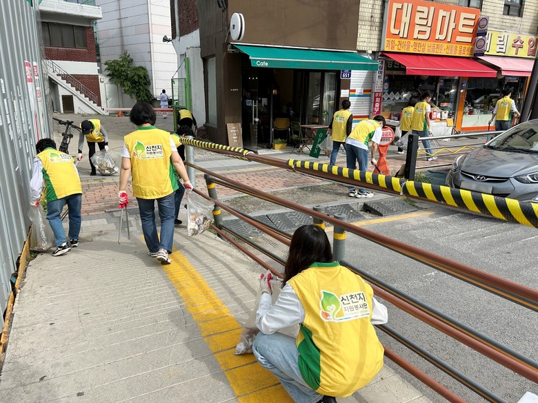 | ▲ 지난 21일 신천지자원봉사단 동작지부가 여의대방로 일대에서 거리 청소 봉사 활동을 진행한 가운데 자원봉사자들이 대림사거리 인근에서 쓰레기를 수거하고 있다. [사진제공 = 신천지자원봉사단 동작지부] |