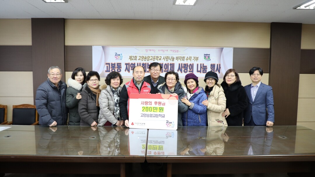 전달받은 기부금은 지난 11월 9일에 진행한 고양송암고등학교 바자회 수익금으로 마련됐으며, 지역사회 복지 증진을 위해 학생 일동이 한마음 한뜻을 모아 고봉동 지역사회보장협의체에 기부금을 전달헸다.
