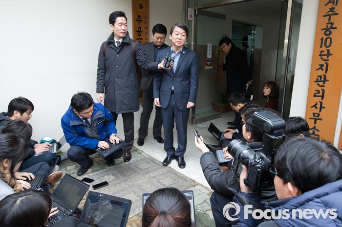 (서울=포커스뉴스) 탈당계를 제출,당적 정리 절차에 들어간 안철수 새정치민주연합 전 공동대표가 14일 오후 자신의 지역구인 서울 노원구 상계동 한 아파트 경로당을 방문한 뒤 취재진 질문에 대답하고 있다.