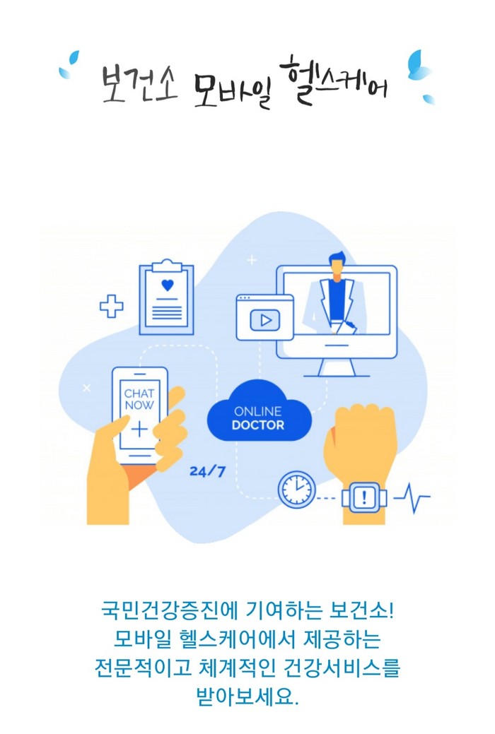 모바일 헬스케어란 대사증후군위험요인이 있는 주민에게 스마트워치를 제공하고 모바일 앱과 연동하여 의사, 건강코디네이터, 간호사, 영양사, 운동사 등 보건소 전문인력이 맞춤형 건강 상담을 제공하는 서비스다.