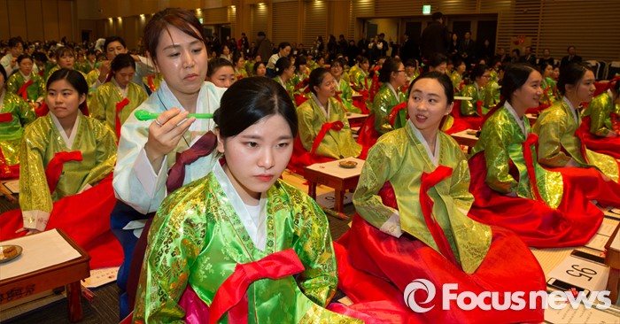 (대전=포커스뉴스) 9일 오후 대전 유성구 대전컨벤션센터에서 고등학교 3학년 학생들을 대상으로 열린 전통 성년식에서 여학생이 머리에 비녀를 꽂는 '계례'를 하고 있다.