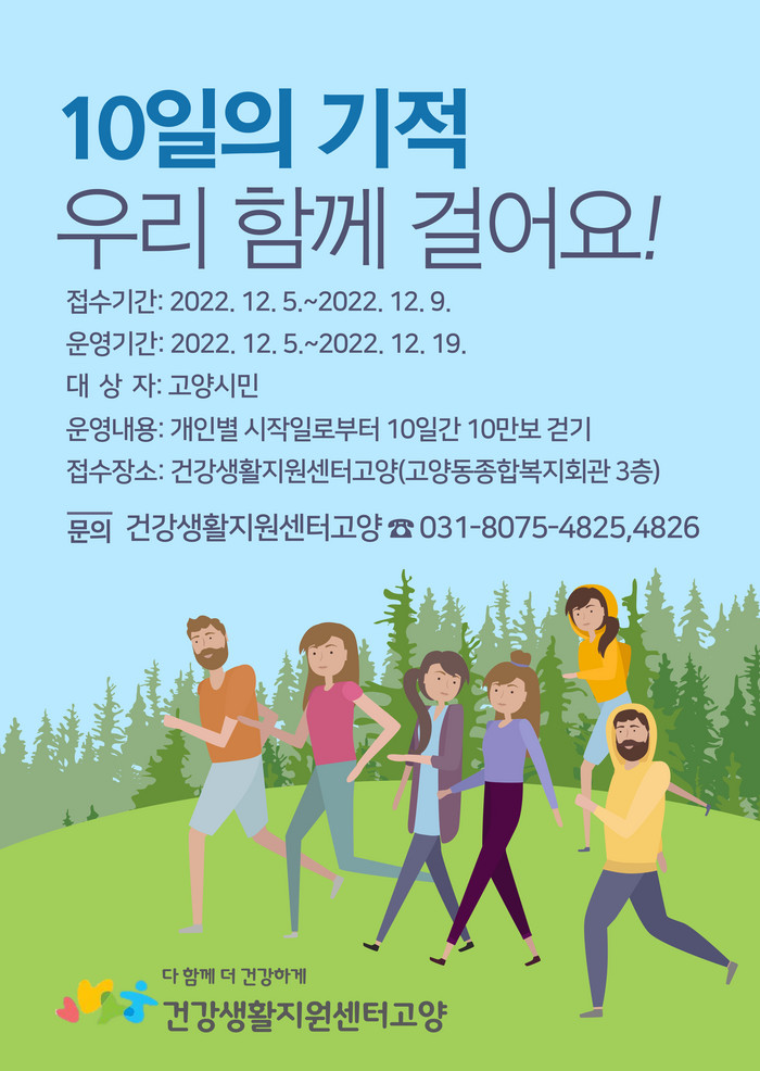 [부자동네타임즈 김인수기자] 고양특례시(시장 이동환) 건강생활지원센터고양에서 12월 5일부터 운동 습관 기르기 10일의 기적 걷기 프로그램을 운영한다