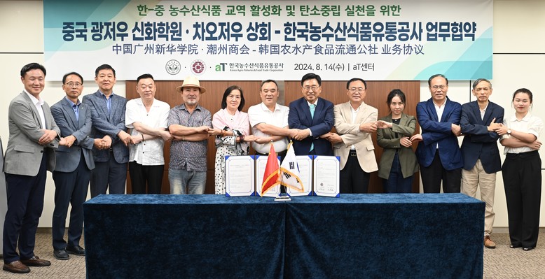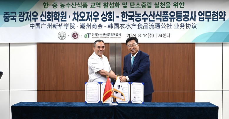 한국농수산식품유통공사(사장 김춘진)는 14일 서울 양재동 aT센터에서 중국 광동성 소재 광저우 신화학원(이사장 류룽하이), 차오저우 상공회의소(회장 류룽하이)와 한중 농수산식품 교역 활성화와 글로벌 탄소중립을 위한 업무협약을 체결했다.