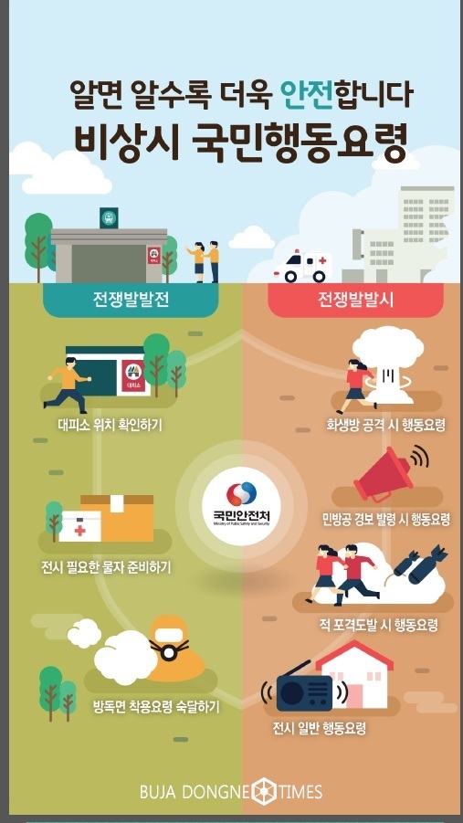 또한 비상 시 대피소 찾기, 방독면 착용 요령, 사태별 행동요령 등 사전에 주변 대피소를 찾아 이동경로를 확인해 두고 상황이 악화돼 북한의 포격도발이나 공습에 대한 경계경보 발령 시 대피할 때 확인해야 할 사항을 담은 '비상사태 시 국민행동요령' 홍보물을 시와 자치구 민원실, 안전체험관, 민원안내실 등에 비치해 활용토록 하고, 시와자치구 홈페이지(누리집)에도 게시해 시민 홍보를 강화하고 있다.