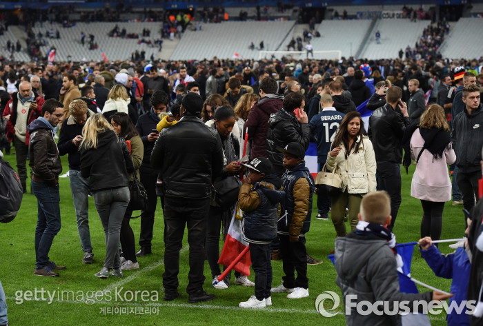 | △ <파리/프랑스=게티/포커스뉴스> 프랑스와 독일간의 평가전이 열린 11월14일(한국시간) 스터드 프랑스에서는 인근에서 발생한 테러로 경기 후 관중이 안전 매뉴얼에 따라 그라운드로 내려왔고 상황을 주시하고 있다. (C)게티이미지/멀티비츠 |