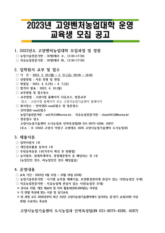 교육 수강을 희망하는 시민 및 농업인은 고양시청 및 고양시농업기술센터 홈페이지에서 관련 서류를 다운받아 3월 31일까지 인터넷접수 및 농업기술센터 도시농업과 인력육성팀으로 방문 접수하면 된다.