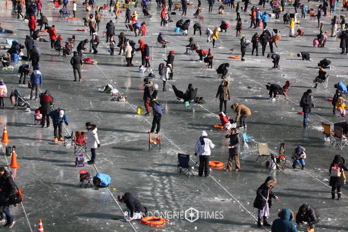 강원 화천 산천어축제 개막 첫날인 14일 매서운 추위속에도 이른 아침부터 수많은 인파가 몰려 얼음낚시를 즐기고 있다.2017.01.14.
