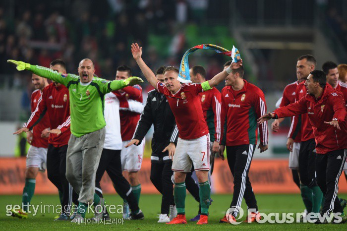| △ <부다페스트/헝가리=게티/포커스뉴스> 헝가리 대표팀 선수들이 11월16일 새벽(한국시간) 노르웨이와의 유로 2016 플레이오프 2차전에서 승리해 본선행을 확정지은 뒤 환호하고 있다. (C)게티이미지/멀티비츠 |