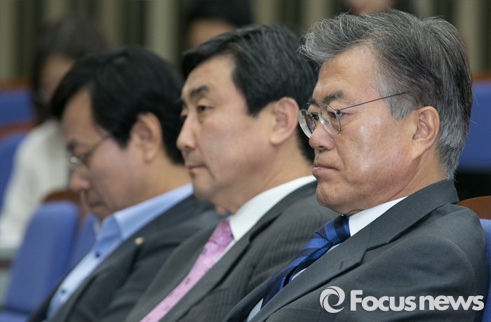 | △ 문재인(오른쪽부터) 새정치민주연합 대표, 이종걸 원내대표, 오영식 최고위원이 5일 오전 서울 여의도 국회에서 열린 의원총회에 참석해 생각에 잠겨 있다. <사진제공=포커스뉴스> |