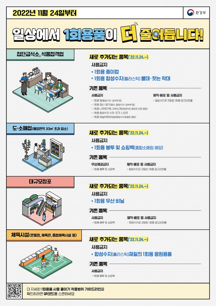 개정된 법에 따르면 식당과 카페의 일회용 종이컵, 플라스틱 빨대 및 젓는 막대, 종합 소매업체에서의 비닐봉지, 대규모 점포에서 우산 비닐, 체육시설에서 합성수지 재질의 일회용 응원용품 등 사용 제한 품목이 확대됐다.