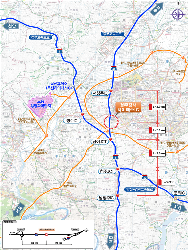 이번 개통으로 서청주나들목과 남청주나들목에 집중되고 있는 교통량*이 분산되어 교통 정체를 해소하고, 청주 서남부 지역의 고속도로 접근성이 크게 개선될 것으로 기대된다.