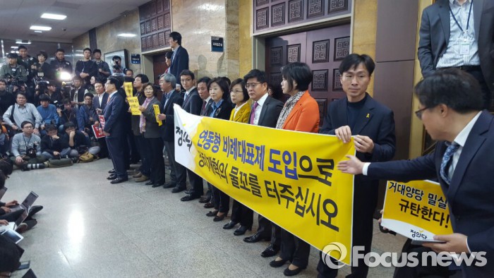 | △ 지난 12일 정의당 의원들이 여야 4+4 회동이 열린 국회 의원식당 앞에서 연동형 비례대표제 도입을 주장하고 있다. <사진제공=포커스뉴스> |