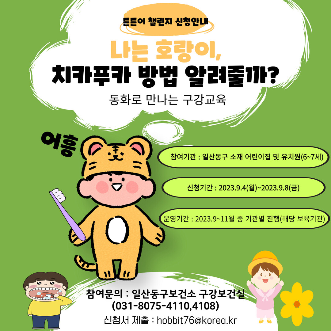 [부자동네타임즈 = 김인수 기자] 일산동구보건소는 관내 유치원 및 어린이집 아동들을 대상으로 치아관리교육사업 ‘튼튼이 챌린지’하반기 프로그램을 시작한다.