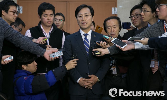 (서울=포커스뉴스) 오영식 새정치민주연합 최고위원이 27일 오전 서울 여의도 국회 정론관에서 최고위원직 사퇴 기자회견을 마친 뒤 취재진 질문에 답하고 있다. 오 최고위원은 문재인 대표가 최고위와의 사전 협의 없이 문·안·박(문재인, 안철수, 박원순) 공동지도부 제안한 것에 반발해 사퇴를 결정했다.