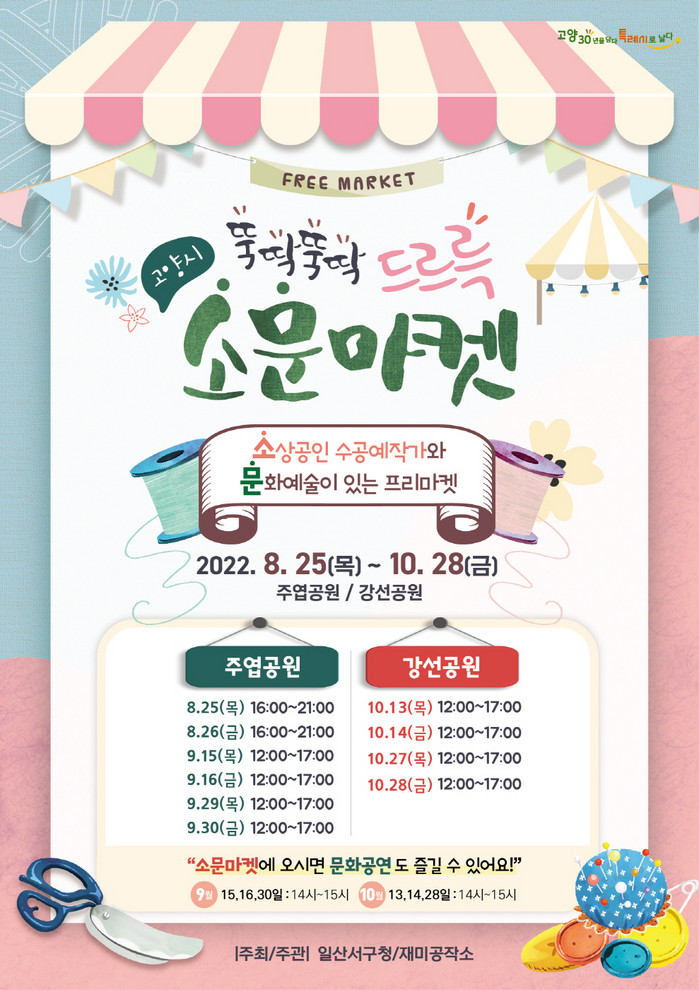 ‘뚝딱뚝딱, 드르륵~~ 소문마켓’은 일산서구에서 고양시 특화 수제품 사업육성과 판매촉진, 판로지원을 위해 마련한 수공예품 직거래 장터로, 소상공인이 직접 만든 수공예품과 문화공연이 어우러지는 프리마켓이다.