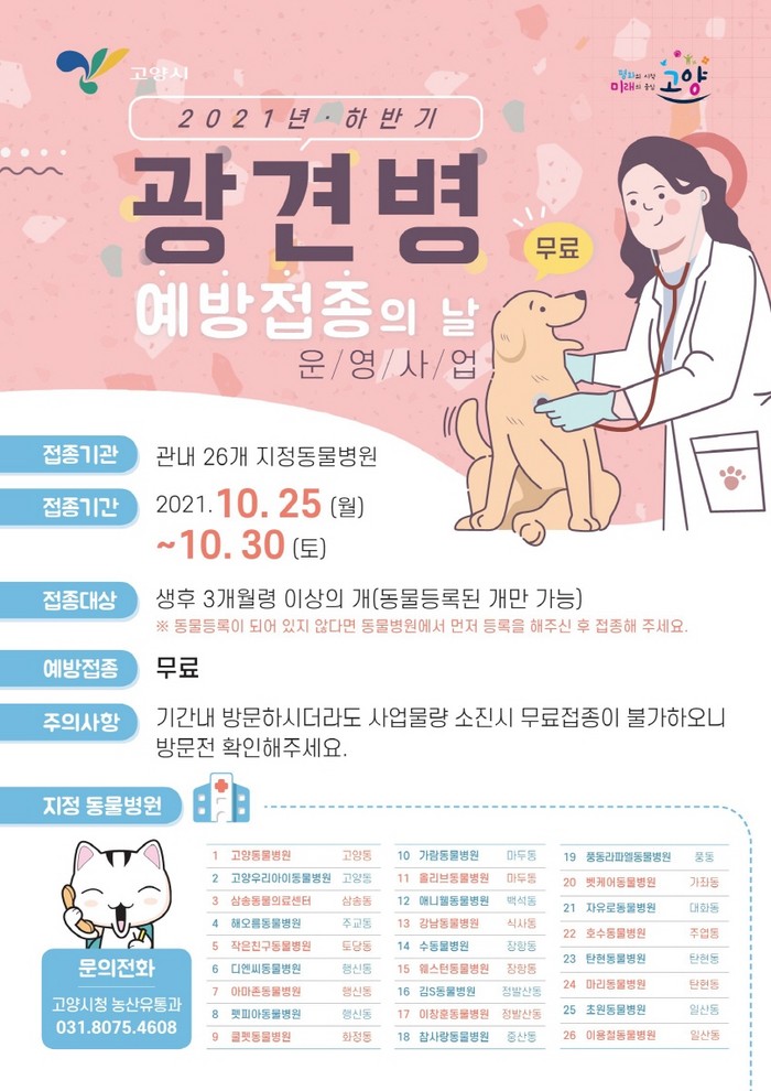 [부자동네타임즈 김인수기자] 고양시은 10월 25일(월)부터 30일(토)까지 6일간 고양시민 소유의 동물등록이 완료된 3개월령 이상의 반려견에 대하여 광견병 예방백신 무료 접종을 실시한다.