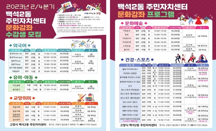 [부자동네타임즈 김인수기자] 고양특례시 백석2동 주민자치회는 3월 20일부터 ‘2023년 2분기 주민자치센터 문화강좌 프로그램’ 수강생을 모집한다.