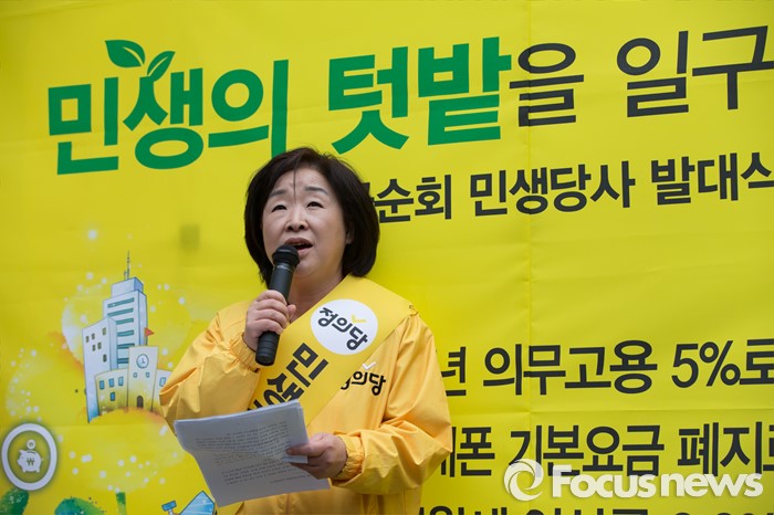 (서울=포커스뉴스) 9일 오후 서울역 광장에서 열린 정의당 전국순회 '민생당사' 발대식에서 심상정 대표가 기자회견문을 낭독하고 있다. 정의당은 이날 청년실업, 전셋값, 통신요금, 골목상권 보호 등에 대한 대책으로 '민생의제 5대사업'을 발표한 뒤 전국을 돌며 국민 캠페인에 돌입할 예정이다.