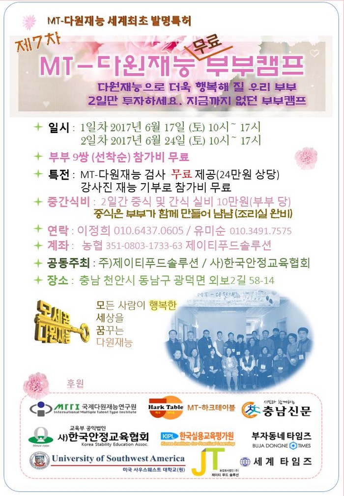제7차 MT-다원재능 부부캠프는 국제다원재능연구원에서 주관하고 교육부공익법인(사)한국안정교육협회, MT-하크테이블연구원, 한국실용교육평가원,미국사우스웨스트대학교(원), 충남신문, 부자동네타임즈, 세계타임즈, 제이티푸드솔루션에서 후원하여 진행한다.