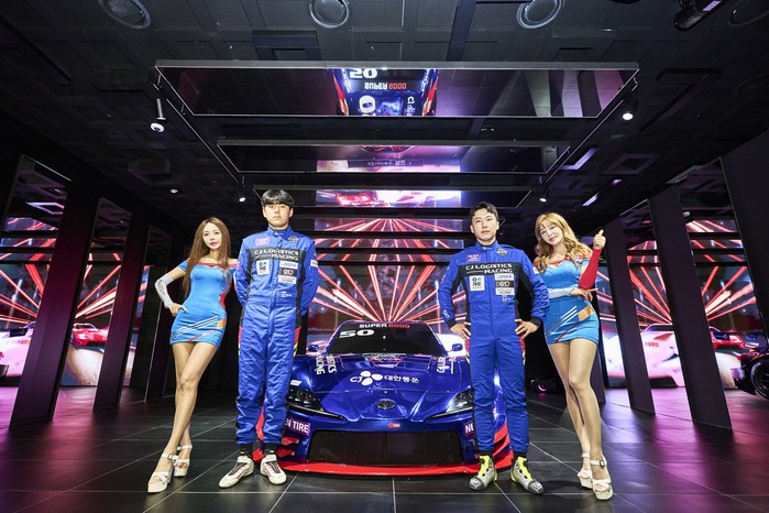 [사진설명] 롯데월드타워 전망대 ‘서울스카이’ 전시존에 전시된 슈퍼 6000 클래스 레이싱카와 CJ로지스틱스 레이싱 박준서(왼쪽)와 오한솔.
