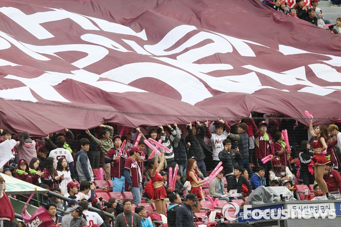 | △ 프로야구 넥센 히어로즈가 넥센 타이어와 네이밍 스폰서 3년 연장계약을 체결했다. 사진은 지난달 11일 잠실구장에서 열린 프로야구 2015 포스트시즌 준PO 2차전 넥센-두산 경기에서 넥센 응원단이 대형 현수막을 이용해 응원하고 있는 모습. 우정식 기자 uhcho@focus.kr |