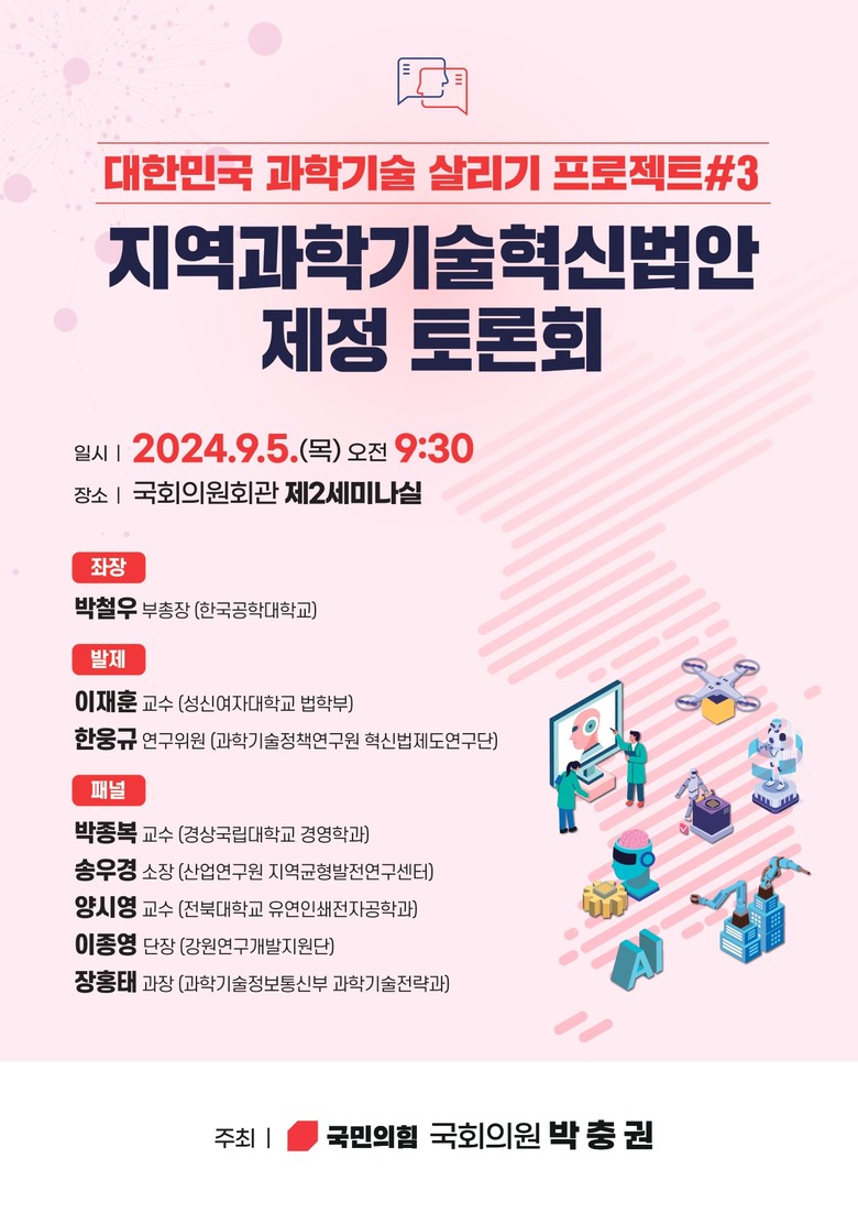 이에 , 이번 토론회는 각 지역의 산업계 · 학계 · 연구계 등 현장의 목소리를 듣고 , 지역에 특화된 과학기술 개발로 지역과학기술 주권과 자생력을 키우기 위한 윤석열 정부 지방시대 마중물이자 지역균형발전의 성장동력이 될 「 지 역과학기술혁신법안 」 ( 박충권 의원 대표발의 ) 의 성공적인 제 정과 조속한 통과를 촉구하고자 개최하게 되었다 .