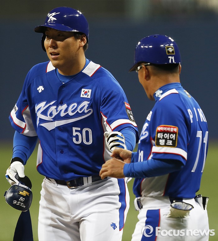 | △ 지난달 5일 오후 서울 구로구 고척스카이돔에서 열린 2015 서울 슈퍼시리즈 대한민국과 쿠바의 2차전에서 5회초 2사, 이대호 타선에 김현수가 대타로 나와 안타를 친 후 코치와 하이파이브를 하고 있다. <사진제공=포커스뉴스> |