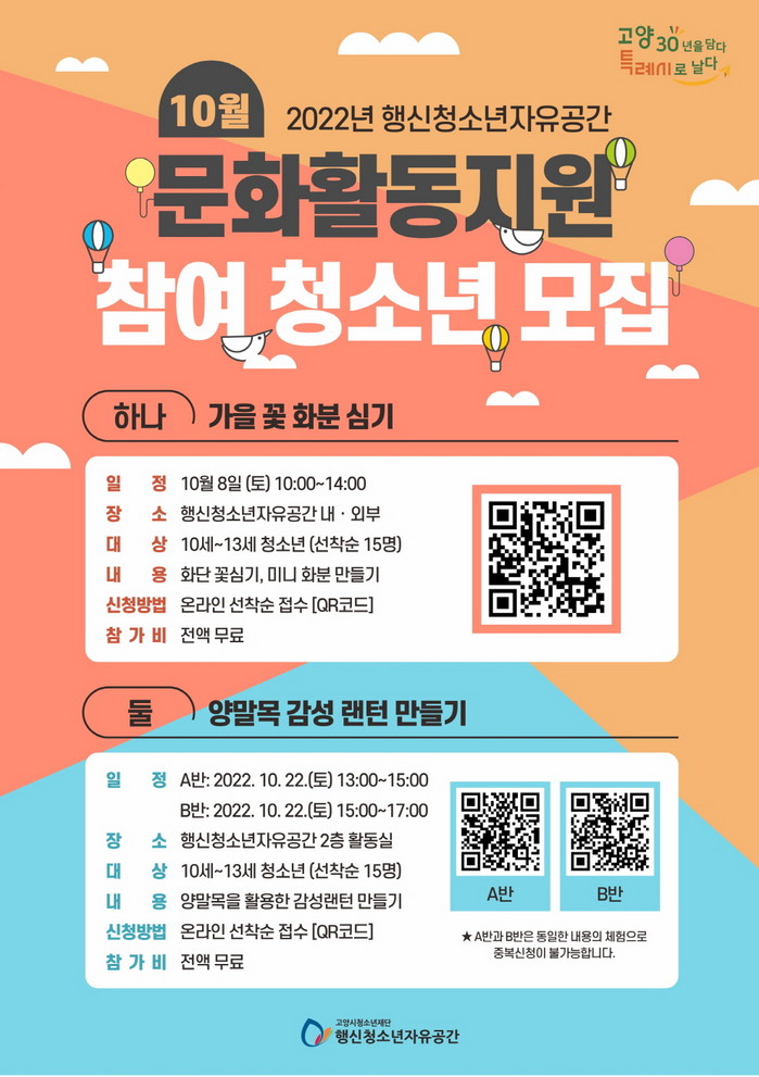 한편 문화활동지원 프로그램은 10세~13세 청소년을 대상으로 프로그램별 15명선착순 모집으로 진행되며 참가신청은 ▲가을꽃 화분 심기, 양말목 감성 랜턴 만들기 9월 26일부터 10월 3일까지, ▲천연 비누 만들기, 달콤한 케이크 만들기 10월 31일부터 11월 7일까지 각각 진행된다. 신청방법은 QR코드로 접속하여 네이버폼으로 작성한 후 제출하면 된다.