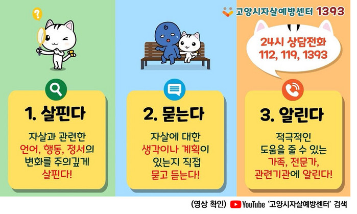 동영상 플랫폼 유튜브에서 ‘고양시자살예방센터’를 검색하면 ‘자살예방 우리가 함께 할 고양’ 영상을 직접 확인할 수 있으며, 고양시자살예방센터는 더 많은 시민들이 확인 할 수 있도록 공공기관, 유관기관, 아파트 단지 등 다양한 곳에 이번 영상을 배포할 예정이다. 관련 문의는 고양시자살예방센터를 이용하면 된다.