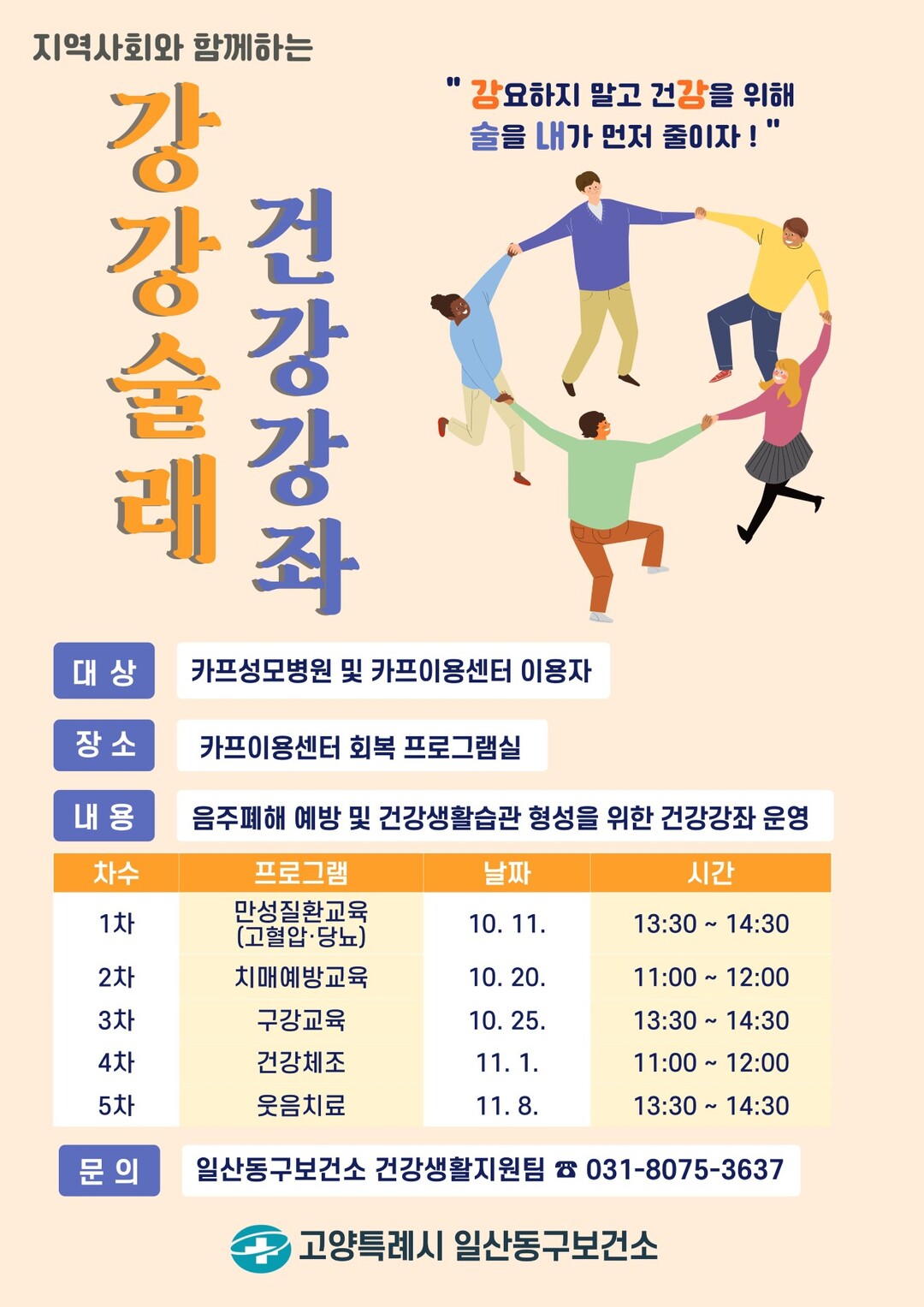 [부자동네타임즈 = 김인수 기자] 고양특례시 일산동구보건소가 지역사회 음주폐해 예방 및 알코올사용자의 건강한 생활습관 형성을 위해 10월 11일부터 ‘강강술래 건강강좌’를 운영한다.